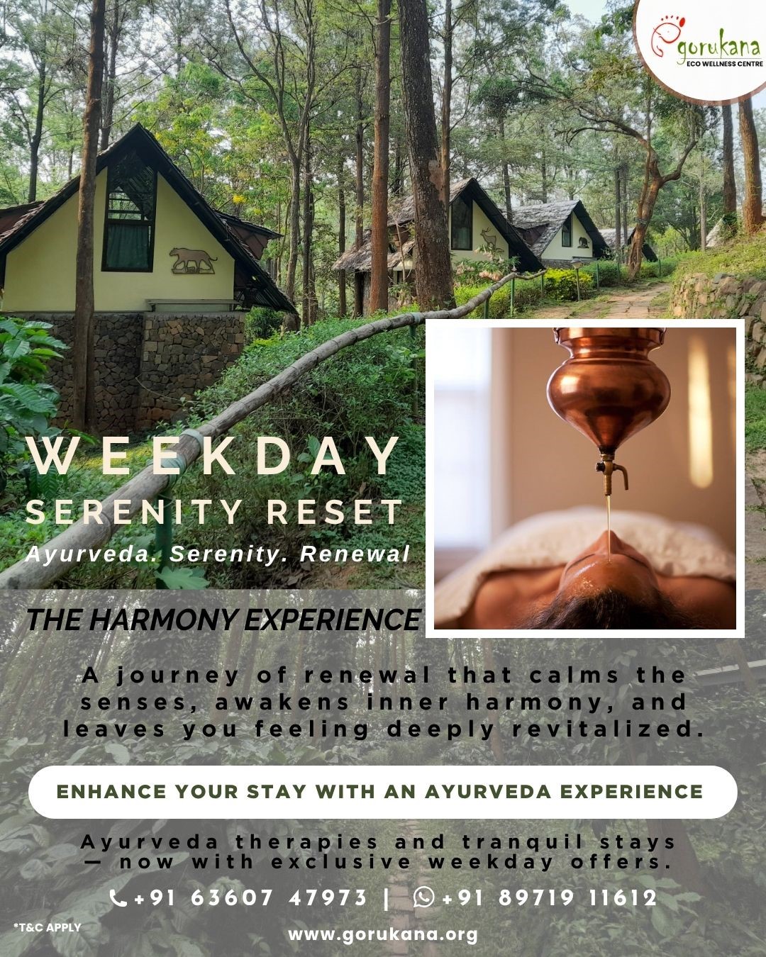 Conveniently located just 180 km from Bangalore and 90 km from Mysore, Gorukana is the ideal destination for those seeking renewal. Rejuvenate with restorative Ayurvedic therapies, unwind in sustainable accommodations, and immerse yourself in rich cultural experiences—each designed to bring lasting balance and serenity to your life.